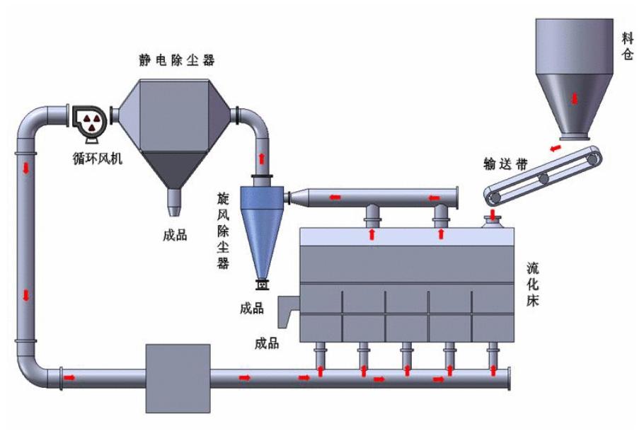 流化床干燥設備是一種高效的干燥設備,適用于無凝聚作用的散粒狀物料的干燥。其工作原理是濕物料進入流化床內與熱空氣接觸,形成流化狀態(tài),使物料顆粒與熱空氣充分混合,進行強烈的傳熱和傳質,從而脫除水分,達到干燥效果。合格的產品由流化床的出料口排出,含塵氣體則經過除塵裝置凈化后排放。
